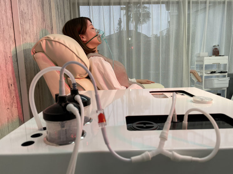 ゆたったりしたソファで<カニューレ>という鼻へ効率よく気体を送り出すチューブを装着頂き、水素吸入を行います。